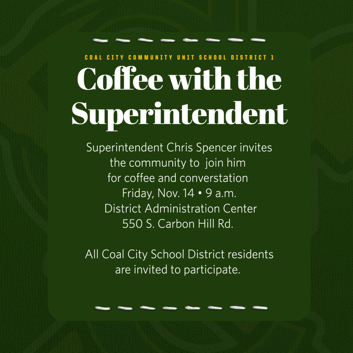Coffee with the Superintendent is a quarterly program that serves to provide information on Coal City School District programs and operations, and keep the public updated on topics of interest and importance.